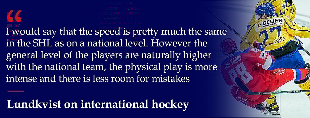 Of course the style of hockey, the level and the pace on the national team is different from the SHL or World Juniors. Lundkvist seems to thrive under that added pressure. “I would say that the speed is pretty much the same in the SHL as on a national level,” he explains. “However the general level of the players are naturally higher with the national team, the physical play is more intense and there is less room for mistakes.“