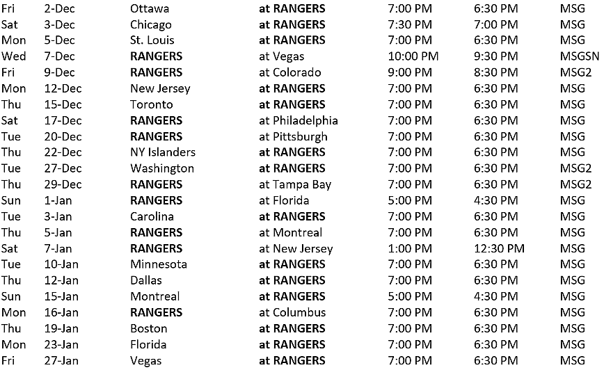 Note: All games airing on MSG Networks, in addition to the network’s pregame and postgame coverage, will also be available on MSG GO, the network’s live streaming and video on demand platform.