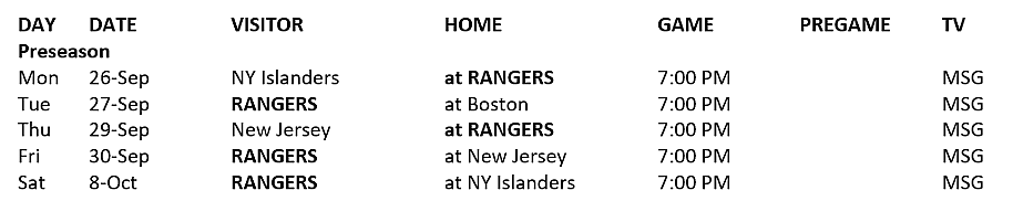 The action begins with preseason action, with five of the Rangers six exhibition games being broadcast on MSG. Fans can watch the October 5 exhibition contest against the Boston Bruins at Madison Square Garden on TNT starting at 7:00 PM.
